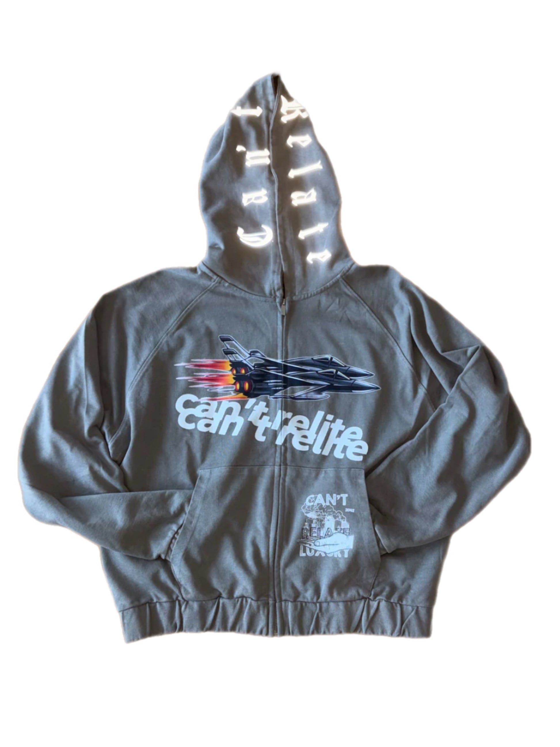 Elevate your streetwear game with this high-end, statement making pullover. Crafted from premium, soft-touch fabric, it offers superior comfort and durability. Featuring a bold, aerodynamic jet graphic and dynamic "Can't Relite" branding, this piece exudes speed, power, and exclusivity. The sleek design is complemented by modern detailing, including a drawstring hood and ribbed cuffs and hem, making it perfect for urban explorers and trendsetters who demand both style and substance. Whether layered for street style or worn as a statement piece, this hoodie is a must-have for those who appreciate luxury with an edge.